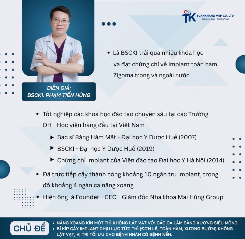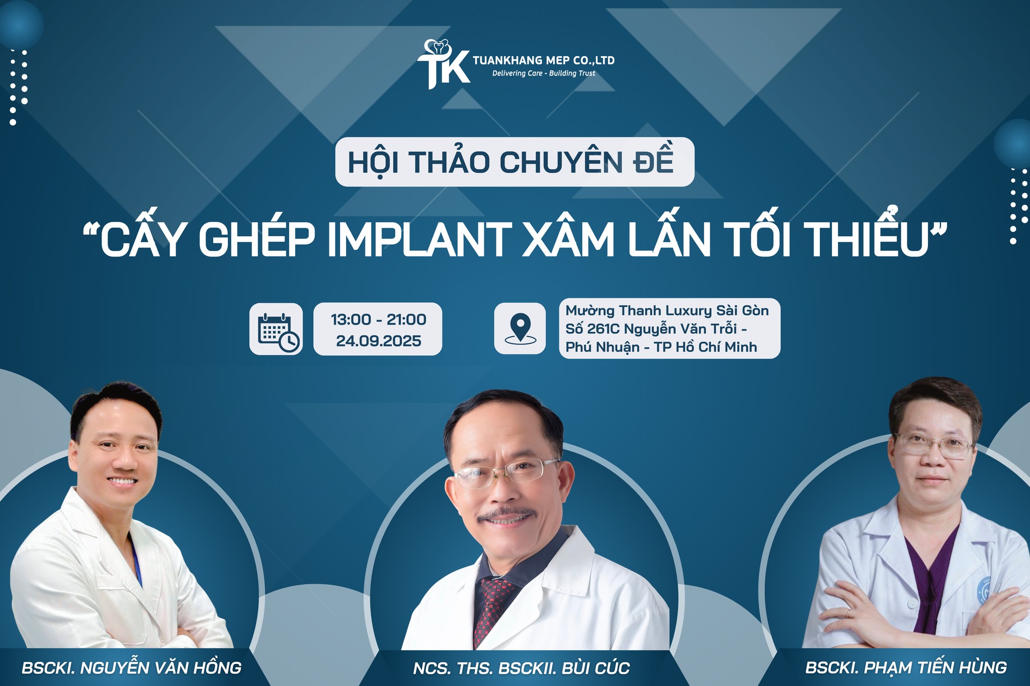 Nhân dịp kỷ niệm thành lập chi nhánh HCM lần này, TuanKhang Mep không chỉ cảm ơn sự đồng hành và tin tưởng của Quý Đối tác – Quý Bs mà chúng tôi còn mang đến kiến thức cập nhật, giải pháp tiên tiến và trải nghiệm thực tiễn cho Quý Bs – Hội thảo “Cấy ghép xâm lấn tối thiểu”.