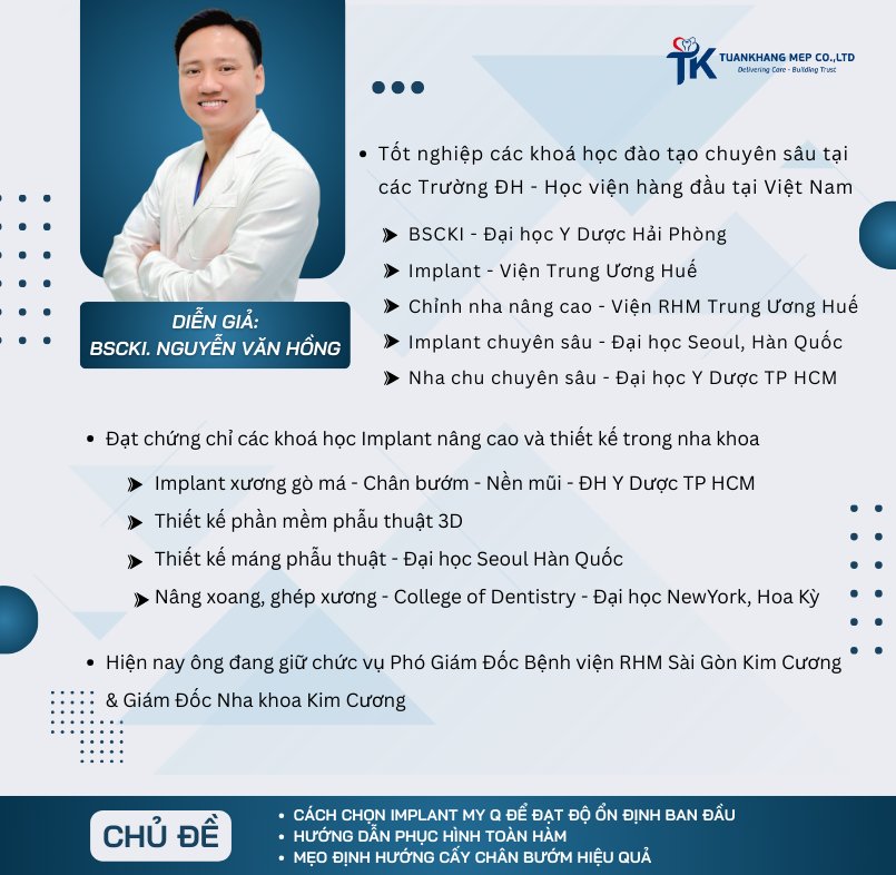 - Diễn giả: BSCKI. Nguyễn Văn Hồng – Phó Giám đốc Bệnh viện RHM Sài Gòn Kim Cương & Giám đốc Nha khoa Kim Cương.