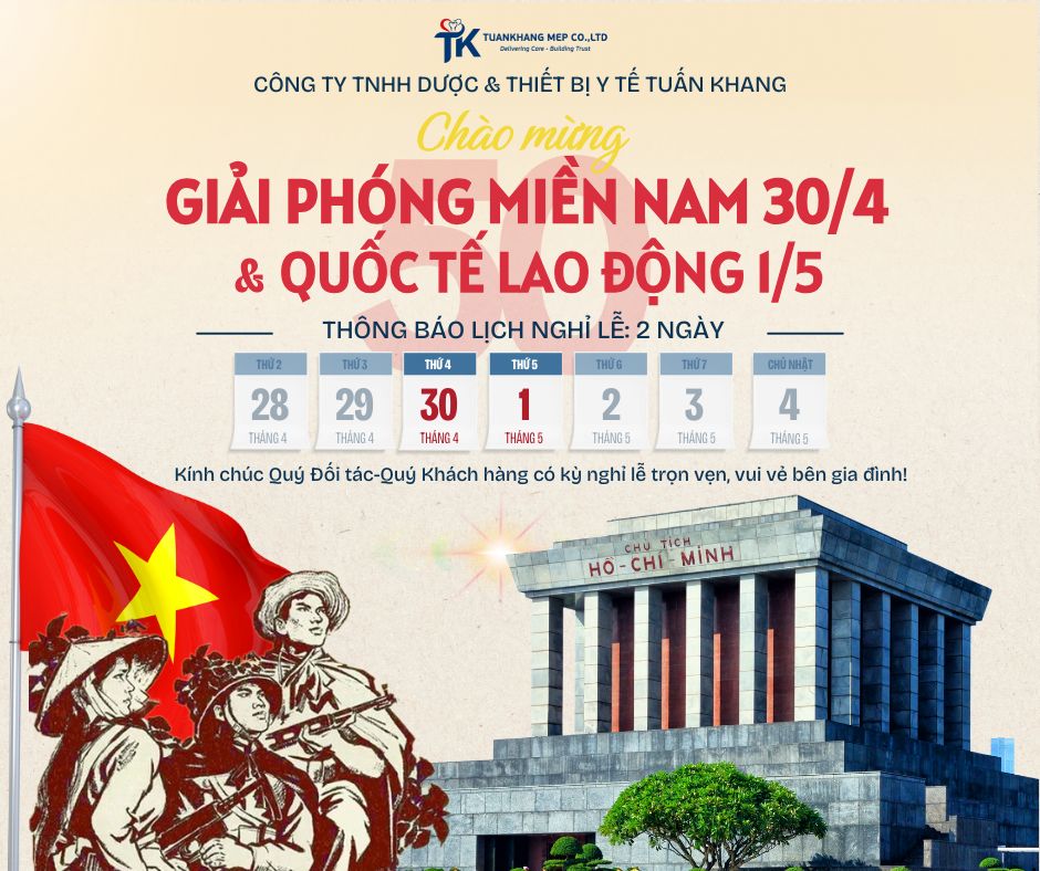THÔNG BÁO NGHỈ LỄ 30/4 - 1/5 Hướng tới kỷ niệm 50 năm Ngày Giải phóng miền Nam - Thống nhất đất nước (30/04/1975 - 30/04/2025), Công ty TNHH Dược & Thiết bị Y tế Tuấn Khang trân trọng thông báo lịch nghỉ lễ 30/04 - 01/05 Thời gian nghỉ lễ ...